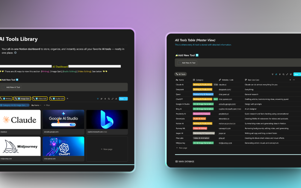 Meet the AI Tool & App Library — a sleek, productivity-focused Notion template designed to store, organize, and access every AI app in one place.