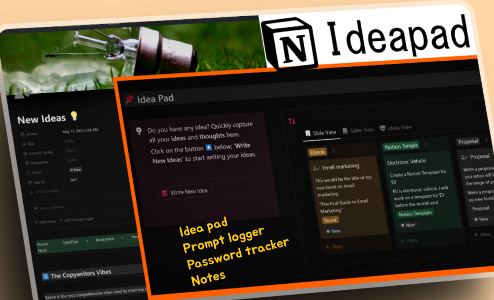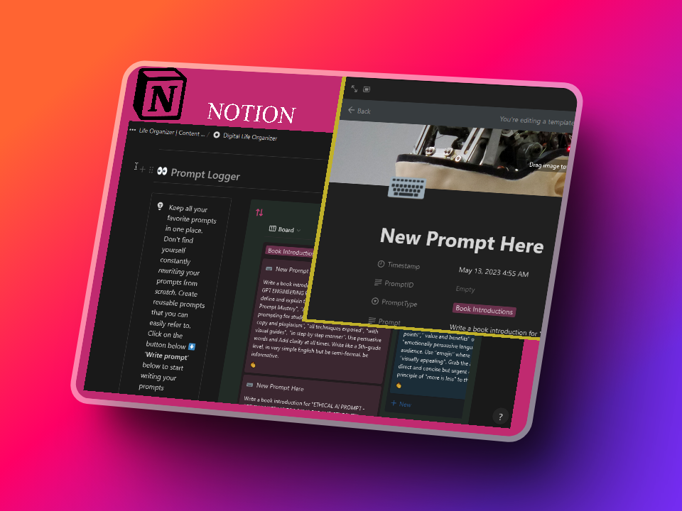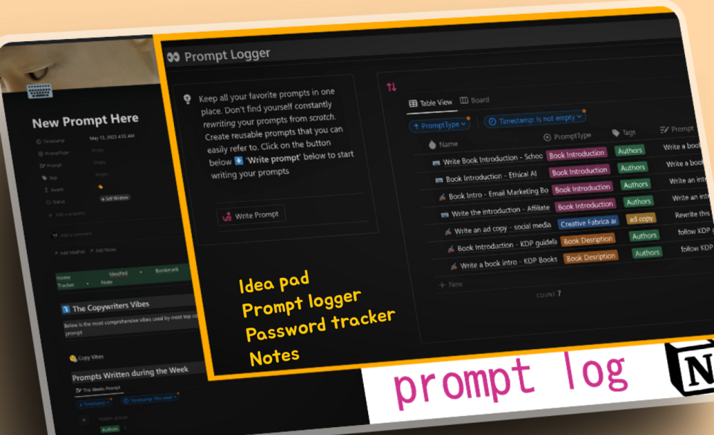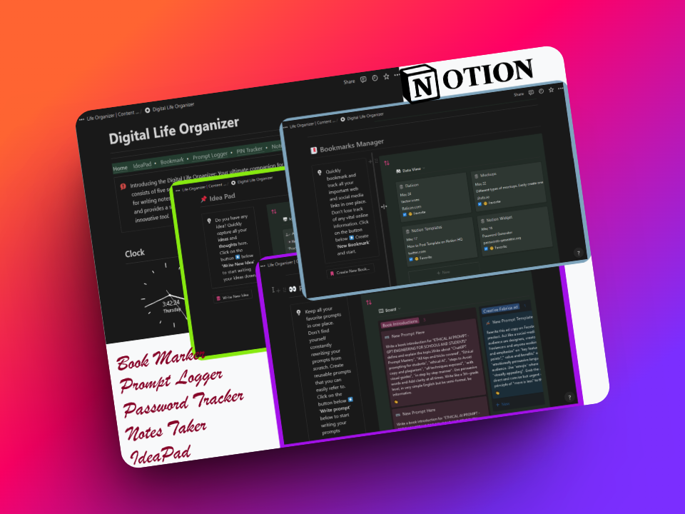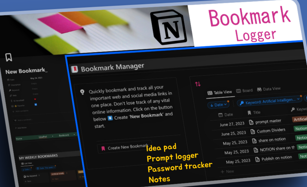 Your ultimate companion for seamless organization! This template consists of five sections: the Ideapad, Bookmark Manager, Prompt Logger, Password Tracker, and a place for writing notes. It captures your ideas, manages your bookmarks, records prompts, tracks passwords, and provides a space for all your notes. Stay organized and make the most of your digital world with this innovative tool.